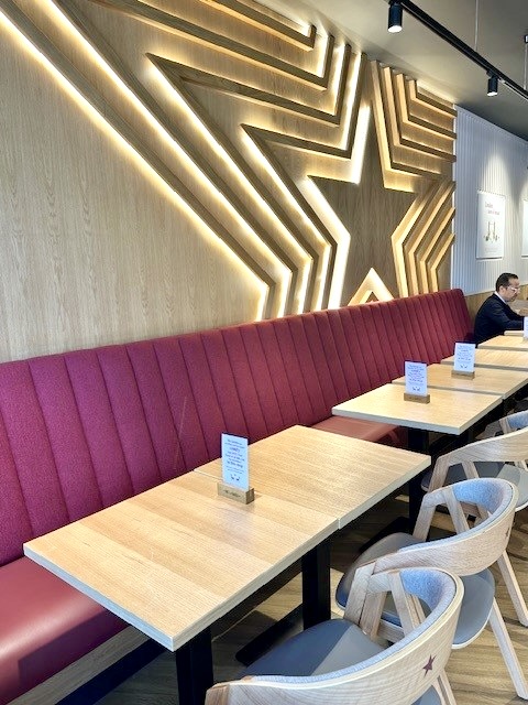 Although it looks a nice square box the site was complicated requiring a 75mm floor screed that had to be dry in two weeks in order to lay floor vinyl as well as there being an insufficient electrical supply. These issues had to be resolved quickly to allow the fit out to continue. The emanating star wall feature makes the seating area that little bit special and it was something that was designed and manufactured in our workshops.